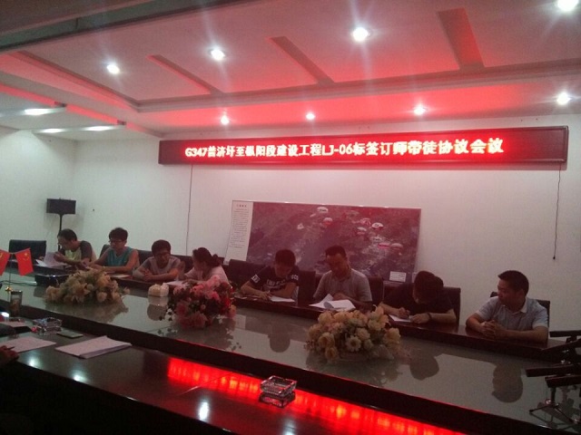 7月25日, G347普濟圩至樅陽段建設工程LJ-06標項目部在會議室舉行“師帶徒”協議簽訂儀式。在項目部全體成員的共同見證下,6對師徒在《師帶徒協議書》上莊重地簽下了自己的名字,涉及技術員、試驗員、財務等多個崗位。