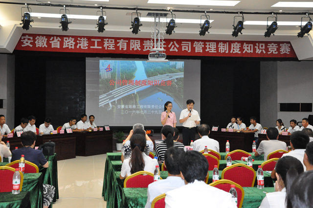 為提高安徽路港公司廣大員工學習公司管理制度的自覺性,營造濃厚的學習氛圍,保障公司管理制度的貫徹執行,助推公司持續、穩定、健康發展,7月29日下午,安徽路港公司在安建大廈3樓會議室舉辦公司管理制度知識競賽。來自公司所屬各單位、項目部的22支代表隊共66名選手參加比賽。本次競賽邀請了集團公司工會副主席吳曉伍到會指導并擔任裁判。公司董事長李振標、黨委副書記馬斌、副總經理袁民、紀委書記、工會主席干戈、財務總監章興紅出席。