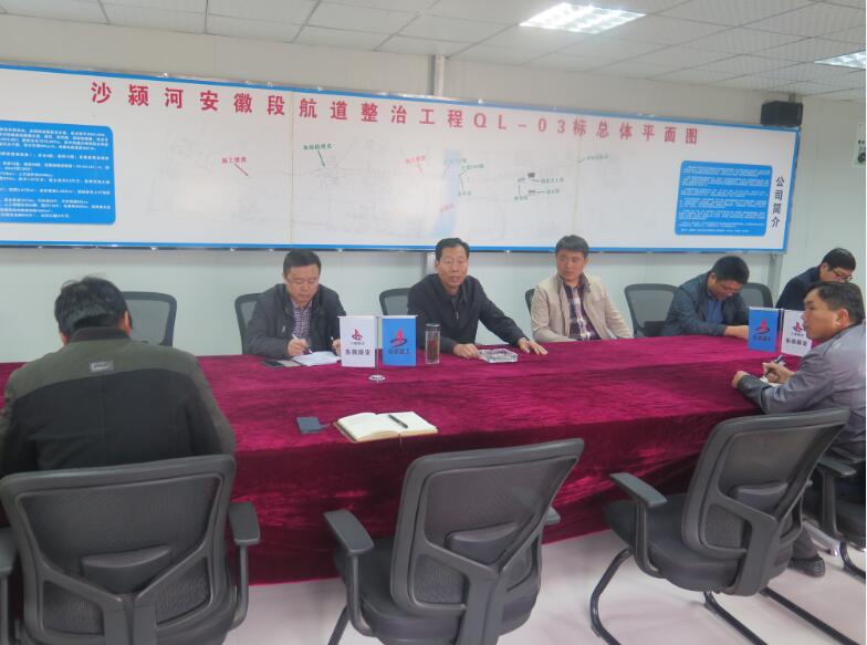 在沙潁河QL-03標項目部,李董事長一行在項目負責人的陪同下察看了引橋附屬、主橋懸澆的施工現場,重點檢查了現場的安全文明施工、臨時用電、臨邊防護,隨后在項目部會議室召開會議。