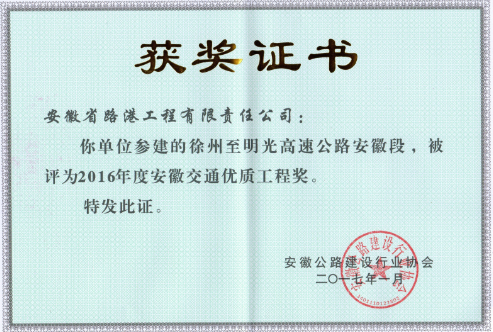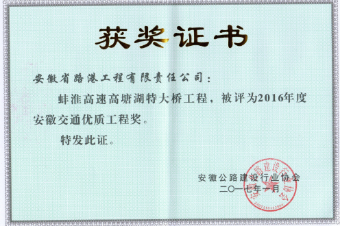 由安徽路港公司承建的合裕航道巢湖復線船閘建設工程、蚌淮高速高塘湖特大橋工程、徐州至明光高速公路安徽段榮獲2016年度“安徽交通優質工程獎”。 “安徽交通優質工程獎”由安徽省公路建設行業協會組織評選,經建設施工單位申報,項目主管部門推薦,專家委員會評審,網上公示,并報省交通運輸廳備案。 此次3個項目獲得該項榮譽,進一步鞏固了公司在省內交通系統的品牌影響力。