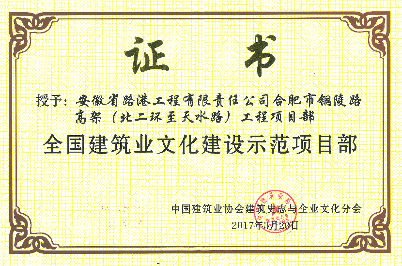 3月25日,從第二屆全國建筑業企業文化建設經驗交流會現場傳來喜訊,安徽路港銅陵路高架(北二環至天水路)工程項目部獲得首批“全國建筑業文化建設示范項目部”殊榮,全國僅有55個項目部獲此榮譽。