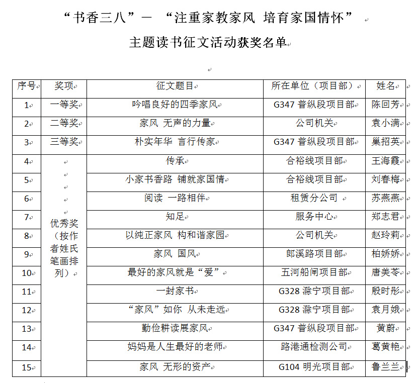 本次活動得到了所屬各單位女職工積極響應和參與,15名女職工結合自己的工作和生活實際,從不同角度生動表達了大力構建和美家庭的美好愿望。評審委員會在15篇征文中通過認真評審,評選出一、二、三等獎各1名,優秀獎12名。此次活動中,公司工會積極組織、廣泛動員,并以此次讀書征文活動為契機,號召全體女職工多讀書、讀好書,形成愛讀書、勤思考、善學習的良好風尚。