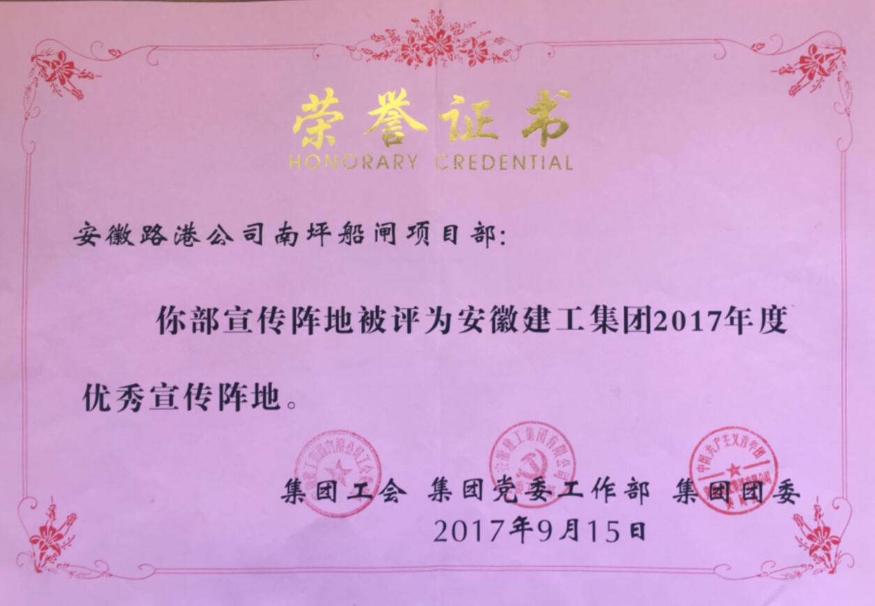 近日,澮河南坪船閘項目部被集團授予 “2017年度優秀宣傳陣地”榮譽稱號。