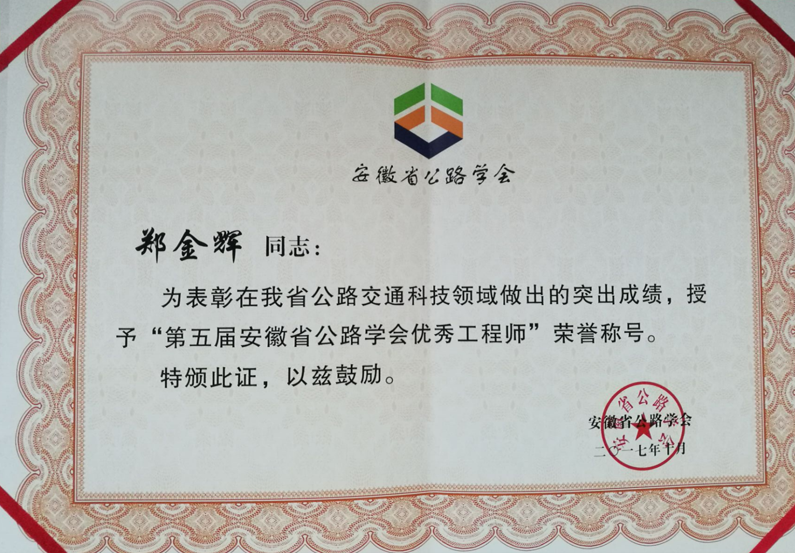 “安徽省公路學會優秀工程師”是我省公路交通行業科技領域的學術和技術帶頭人,是全省公路交通行業優秀工程技術人員的代表。
