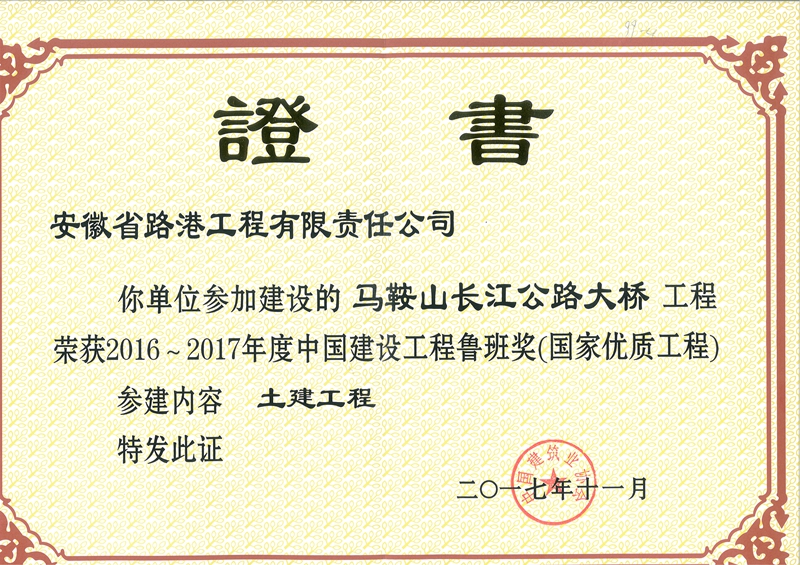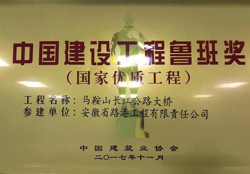 11月6日,從在北京釣魚臺國賓館召開的紀念魯班獎創立30周年暨2016~2017年度創精品工程經驗交流會上傳來喜訊,安徽路港參建的馬鞍山長江公路大橋工程榮獲2016年-2017年度中國建設工程魯班獎(國家優質工程)。