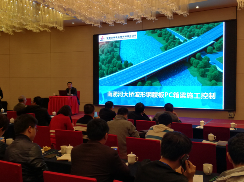 本次會議以安徽路港公司承建的南淝河大橋為工程背景,詳細介紹了波形鋼腹板橋梁的概況、發展與創新、橋梁類型的應用技術、波形鋼腹板生產制造及施工控制等,內容豐富,涵蓋全面。安徽路港郎溪路項目部趙家俊作為特邀講師,對南淝河大橋波形鋼腹板PC箱梁的施工控制進行了論述,深受與會人員好評。