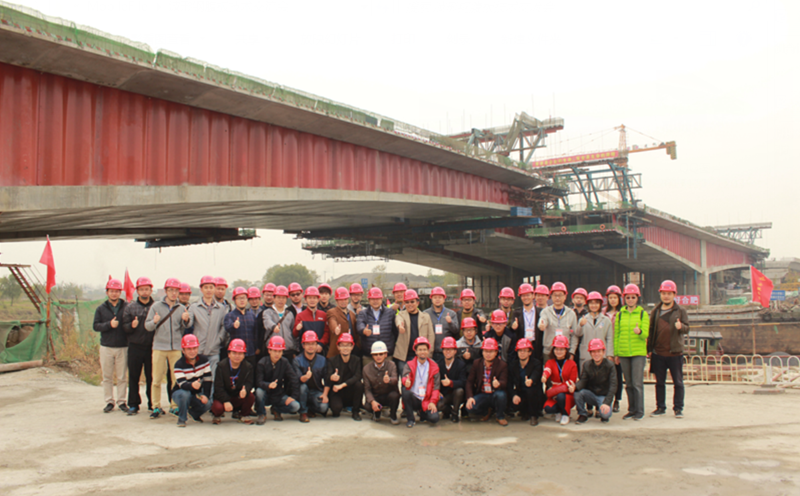 12日上午,與會人員參觀了安徽路港承建的郎溪路高架項目南淝河大橋施工現場,對該工程的施工質量以及安全文明管控給予了高度認可,對安徽路港公司在波形鋼腹板橋梁施工方面做出的積極貢獻給予高度贊揚。