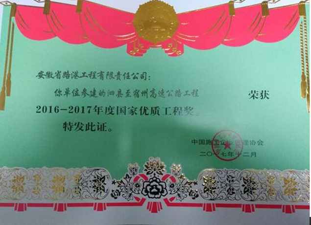 近日,安徽路港公司承建的泗宿高速10標在榮獲交通部優質工程“李春獎”基礎上,再次榮獲2016-2017年度國家優質工程獎,這也是安徽路港首次獲得該獎項。同時,徐士征同志被授予“國家優質工程突出貢獻者”榮譽稱號。