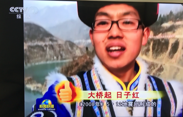 欄目以民生視角,報道了綿陽市北川桃龍藏族小伙尹超,春節回家帶著家人一起來到唐家山堰塞湖跨湖大橋施工現場,喜看家鄉災后重建變化的情景?!翱粗鴺蚍浅5钠练浅5暮陚ィ倚睦锓浅5母吲d,就像咱們的羌紅一樣紅紅火火,同時也想為咱們的建筑工人點贊?!币f。