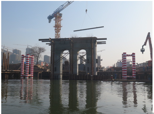 沙潁河QL-03標主橋主墩墩柱共6根,位于沙潁河河道兩側,高22.5m,其中水下部分10.0m,中墩為3.0×3.0m方形柱,邊墩為半圓形墩柱,尺寸為R180cm×3m×3m。自5月份開始鋼平臺施工以來,在公司的指導和幫助下,項目部全體職工齊心協力,先后克服了24m鋼板樁插打困難、圍堰內基坑開挖深度大(開挖達12m)、下部結構受鋼板樁圍堰內圍