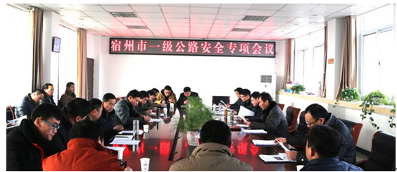 2月1日上午,宿州交通投資集團有限公司召開2016年第一次宿州市一級公路安全生產專項會議,通報2015年全市一級公路建設安全生產工作,安排部署2016年重點工作任務,各參建單位項目經理及專職安全員參加會議。會議由宿州市交通投資集團有限公司副總經理朱鵬主持。
