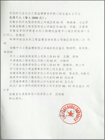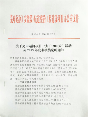 蕪申運河城區段02標2015年在工程質量、工程進度、完成產值都圓滿完成業主計劃進度目標,獲得業主2015年度工程質量考核獎5萬元、安全環保及文明施工考核獎3萬元、先進單位獎勵8萬元,同時邢磊同志、石英卓同志因表現突出,分獲先進個人獎勵5000元,共計17萬元。