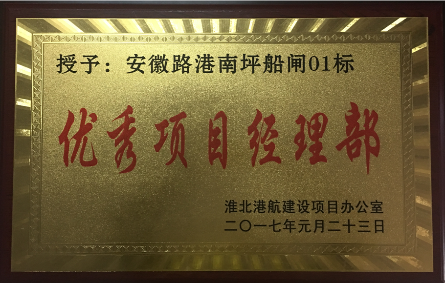 春節前夕,在建設單位淮北港航建設項目辦組織的年度評選中,澮河南坪船閘工程01標項目部被授予2016年度“優秀項目經理部”榮譽稱號,項目部班子成員和安全負責人被授予2016年度安徽省港投集團“先進個人”榮譽稱號。