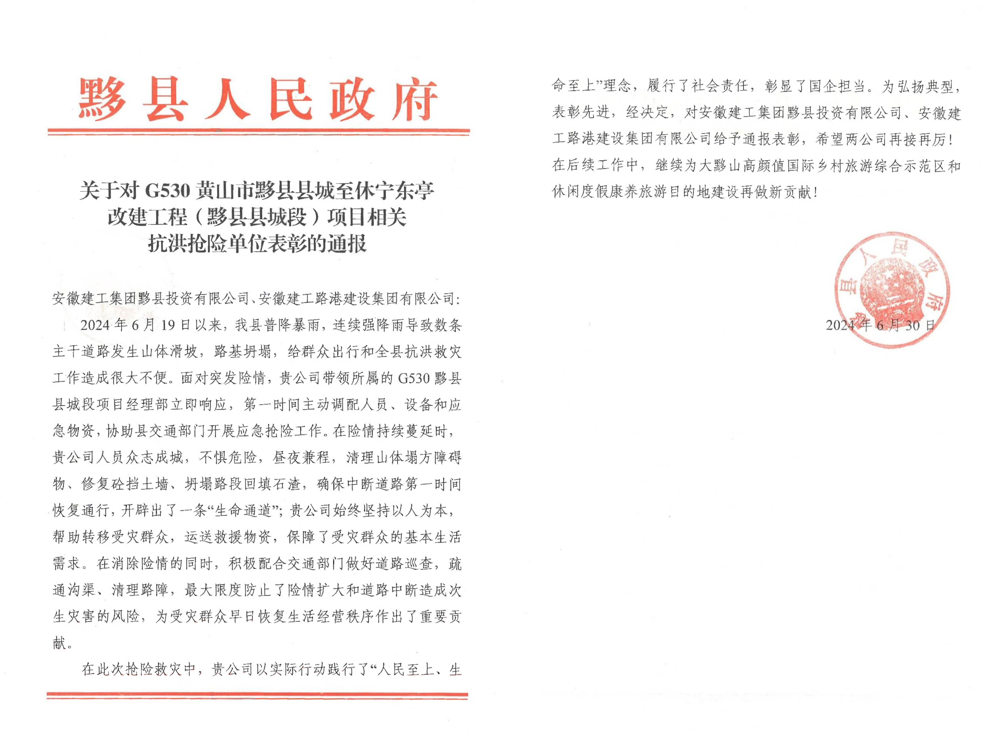 表揚信指出,6月19日以來,黟縣受強降雨影響,河水陡漲,導致數條主干道路以及邊坡塌方。面對災情,項目部第一時間組織人員、機械,協助縣交通部門開展應急搶險工作,確保中斷道路第一時間通行,有力保障受災人員生命財產安全。