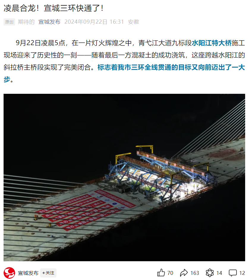 宣城市人民政府發布、宣城播報:水陽江特大橋主橋順利合龍!