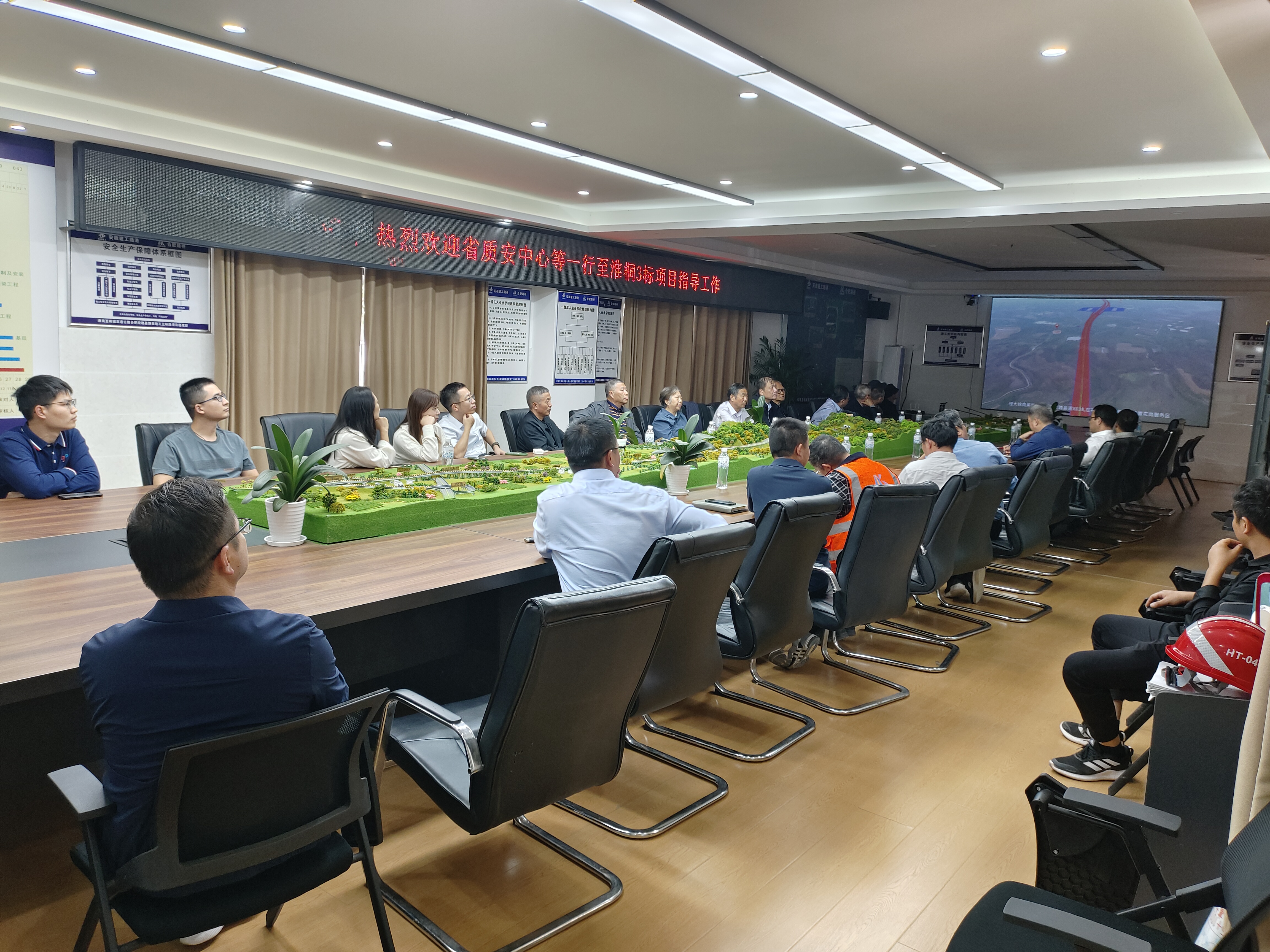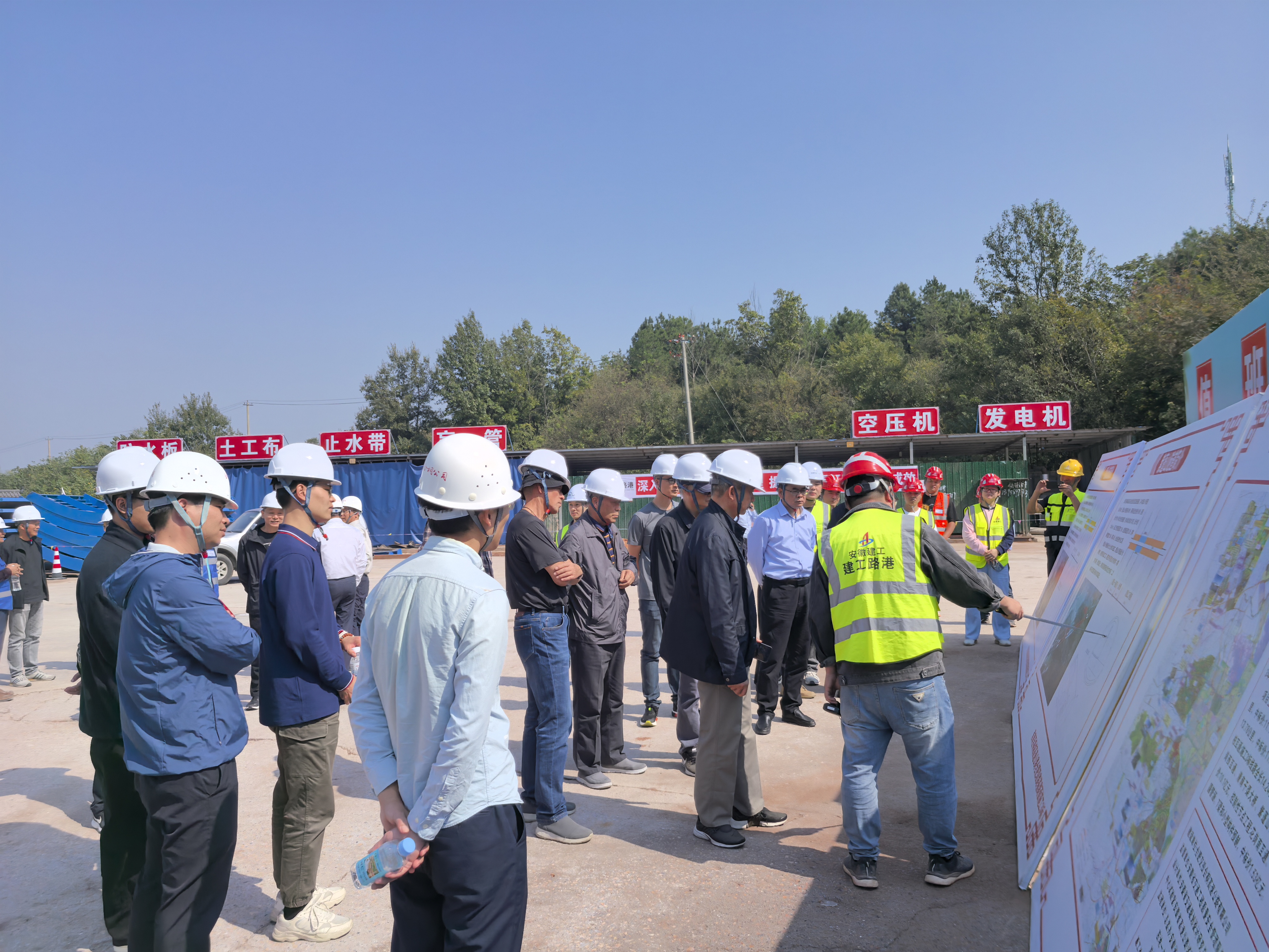 高學華一行首先參觀了紫蓬山隧道口施工現場,聽取了項目部關于隧道概況及當前施工進展匯報,隨后在會議室觀看項目施工動畫、航拍視頻并就當前施工的重難點展開了座談交流。