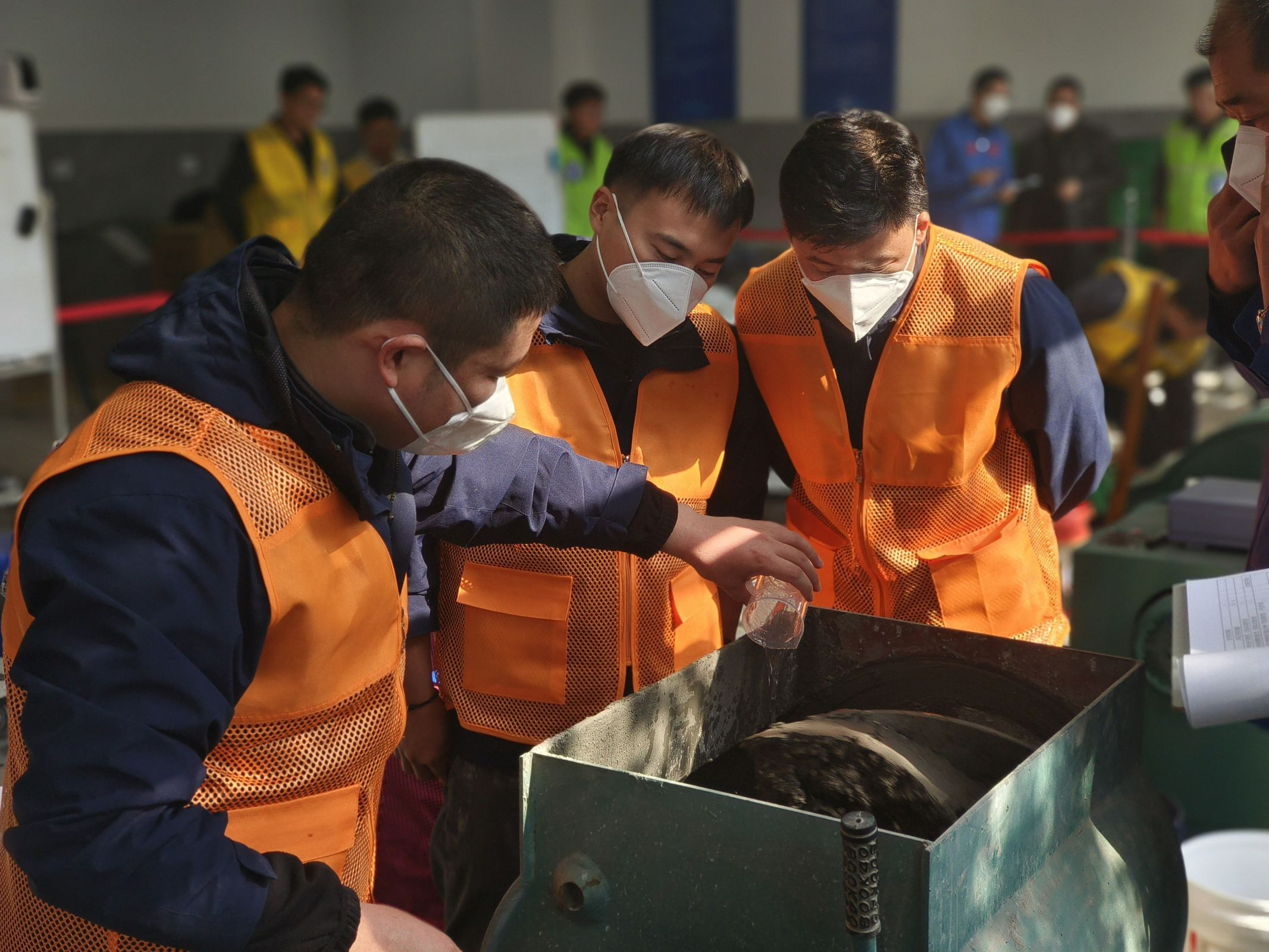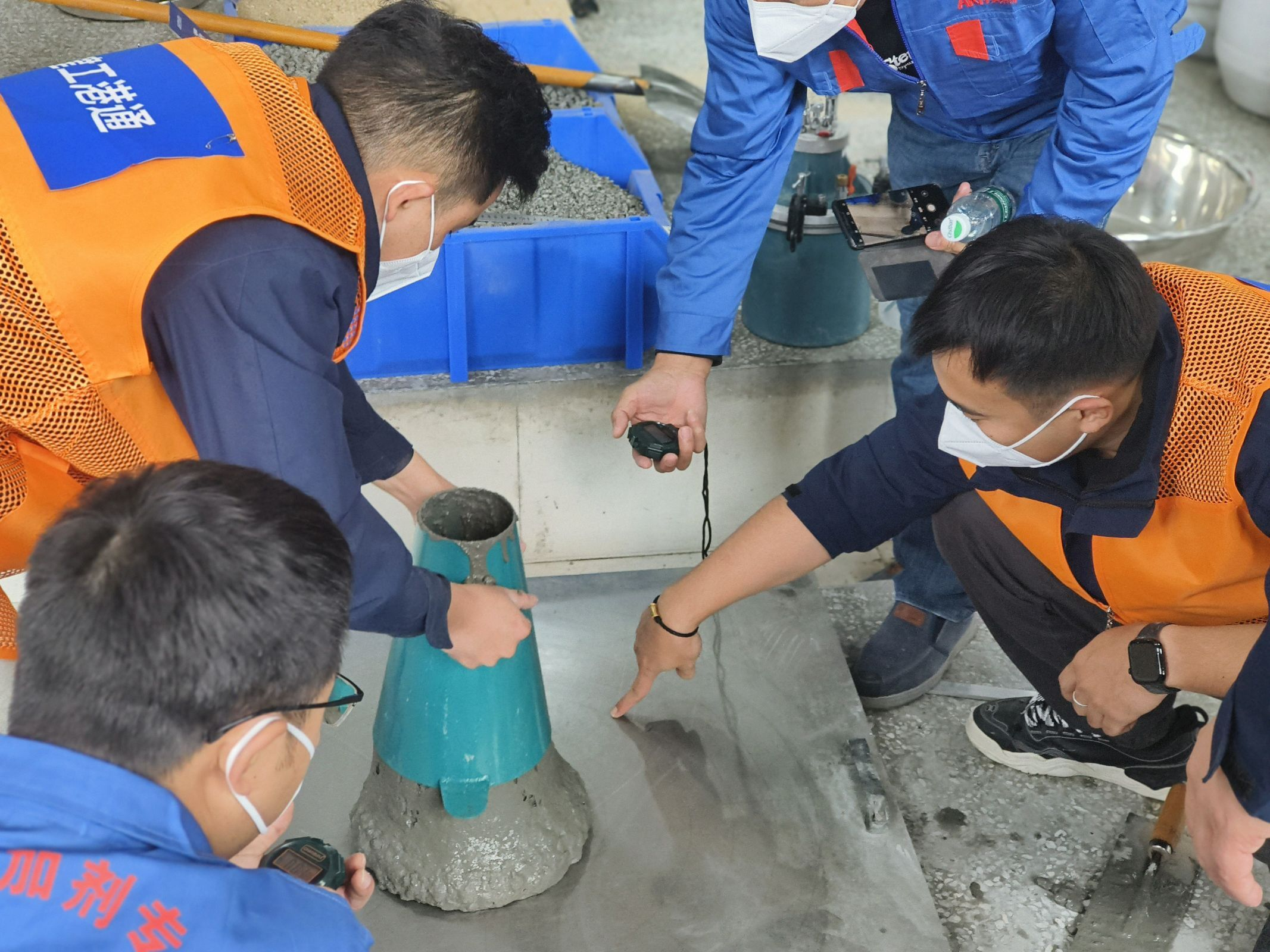 活動中,技術人員從配合比的規范性、科學性、經濟性著手,設計出混凝土基準配合比進行現場試拌,同時現場調配外加劑配方,確?;炷粮黜椆ぷ餍阅苓_標。試驗過程中,技術人員展現出良好的精神風貌和專業的技能操作,贏得評委老師們的一致好評。