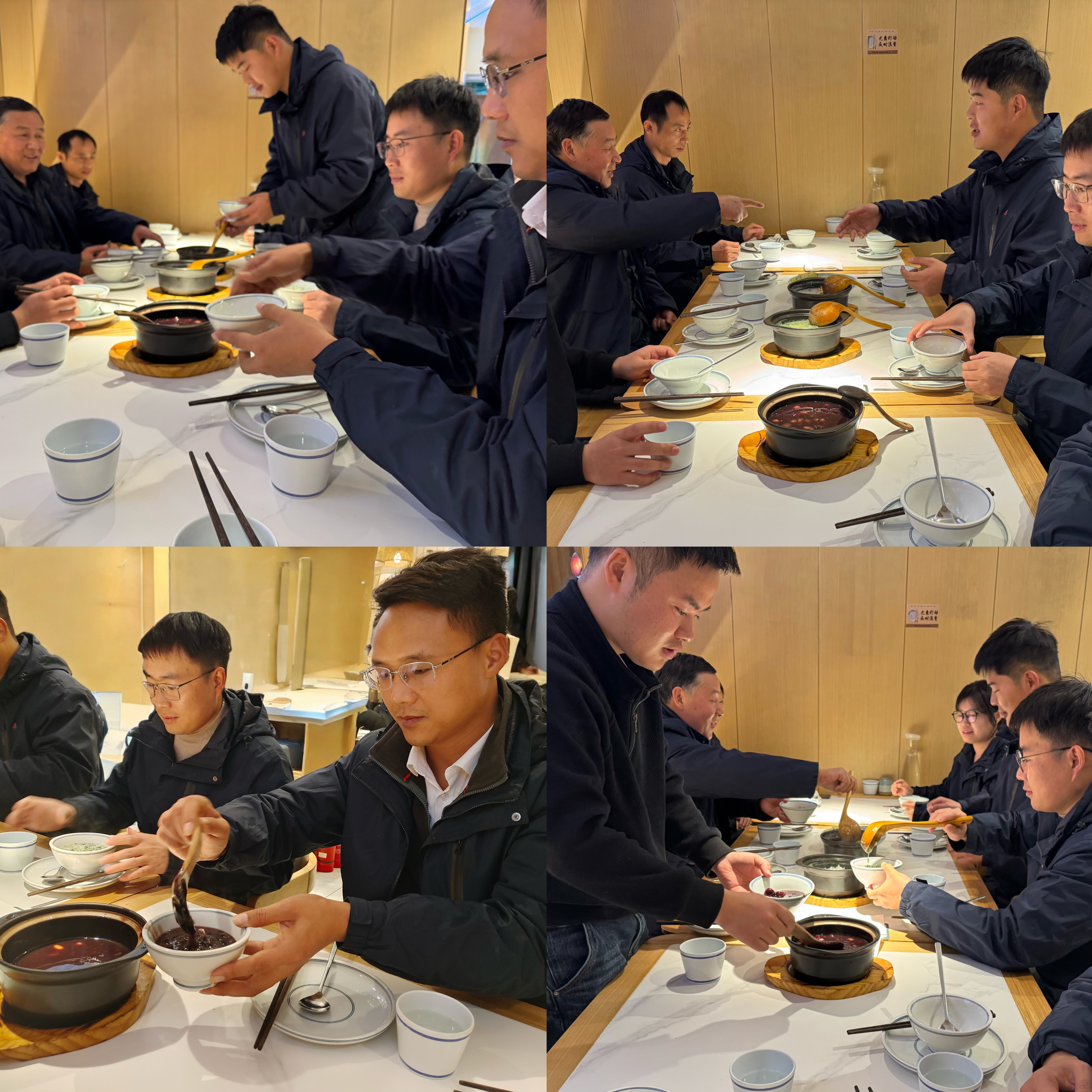 合周02標項目食堂內一片繁忙景象。廚師們早早忙碌起來,將糯米、紅棗、紅豆、薏仁、桂圓、蓮子等十多種食材精心搭配,仔細清洗后下鍋熬煮。各種食材相互交融,散發出誘人的香氣。職工們認真擺放桌椅、準備碗筷,為大家營造了一個溫馨舒適的用餐環境。